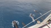 | 29. nap, 2024.05.04. , Dhigurah cetcápa pontEz az a pont, ahol egész évben lehet cetcápákkal találkozni. Két napja látták barátaink ezen a ponton őket. Cetcápák hiányában, mantarájákkal sznorkeleztünk. Ez is fantasztikus élmény volt. A manták úgy repülnek a vízben, ahogy a madarak a levegőben, hatalmas állatok és mégis nagyon kecses a mozgásuk.. | 30. nap, 2024.05.05. , ÚjrahorgonyoztunkAz 50 kilós horgonyunk eddig még csak Új-Zélandon Opuában csúszott meg. De itt a vékony homokon nem mindig tart rendesen. Az éjszaka folyamán 5 métert csúszott, ezért újrahorgonyoztunk.. | 31. nap, 2024.05.06. , Pezsgő bontós vitorlázás. | 32. nap, 2024.05.07. , Szörf hely. | 33. nap, 2024.05.08. , Északi szélben elhagytuk a horgonyzóhelyet. | 34. nap, 2024.05.09. , Kiálltunk a csatornából. | 35. nap, 2024.05.10. , Hatvan mérföld sqallos menetbenA nedves évszak nyomunkban van. A nyugati szelek már rég megérkeztek, kezdődik lassan a nedves évszak is, egyre több az esőfelhő és a squall. Hatvan mérföldet terveztünk a következő atollig. Már amikor kijöttünk az atollból megkaptuk az első erős áramlást, majd az első sqallt is. Az áramlás nagyon erős ezen a részen, ahogy az atollok között áramlik a víz, 2.6 volt a legerősebb, de általában 1-2 csomó között volt (lehet, hogy az újhold miatt is). Az északnyugati szél a sqallokkal változott jött-ment, ezért a vitorlákat is folyamatosan állítanunk kellett hozzá, illetve a sqalloknál reffeltünk vagy ejtettünk. A távolból erős döghullámzás jött, valahogy szemből jöttek, pedig a szelet raumosan kaptuk. kicsit kaotikus volt a tenger, igazi dolldrum efektus. De a squallok szelei nem voltak olyan vészesek, a legerősebb szelünk 23 csomó volt, azért a katamaránnál folyamatosan a szélhez kell állítani a vitorlákat, mert nem tud megdőlni, mint egy egytesű és nem tudja kiengedni a szelet a vitorlákból, csak túlterhelődni tud. A squallok után gyakran eltűnt a szél, ezért motort indítottunk, mert időben, még naplemente előtt szerettünk volna a következő horgonyó helyre érni. Naplemente előtt kapásunk volt és kifogtunk egy mahi-mahit. Ebben az izgalmas menetben Johanna délután ötkor el is aludt, és csak vacsorázni ébresztettük fel, mert a friss halvacsoráról nem akartuk, hogy lemaradjon. Hat óra előtt dobtuk le a horgonyt, a másik hajó kapitánya kite-szörffel jött ki elénk. Öt méter sekély gyönyörűen kék vízben dobtuk le a horgonyt és élveztük a naplementét, mely egyre korábban van, ahogy közeledünk az Egyenlítőhöz. Este néztük, miért van víz a fürdőszoba padlón, kiderült, hogy résnyire nyitva volt a tetöablak. Nem is emlékeztünk mikor nyitottuk ki, már egy jó ideje nyitva lehetett, de eddig mindig olyan jó idő volt. A Maldívra érkezésünkor volt egy nagyobb eső. | Folytatás a következő oldalon... | | | |