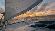 | 7. nap, 2024.06.02. , Hatodik nap – megérkezik a passzátszélAz éjféli viharcella után 20 perccel jött a következő, ezután folyamatosan jöttek a squallok a délkeleti szél 14-16 csomó volt, a squallok 19-20 csomós befújásokat hoztak. Éjszaka sötét volt, már a hold sem világította meg ezeket a squall felhőket, csak négy körül jött fel. Egy kis segítő áramlás is érkezett, mert száguldani kezdtünk a hajóval 7-8.5 csomóval reffel fővitorlával. A squallos idő fél 5-ig tartott, amikor is kezdett déliesedni a szél és 16-17 csomóra beállni. Ezután tovább fordult és hajnalban már negyedszélről kaptuk a szelet. Kicsit dobogós volt a menet, de jól haladtunk így is irányra, még mindig reffelt vitorlával. Reggel 8-kor déliesedett újra a szél és dél-délkeletire fordult 13-14 csomóval, a befújások 16-17 csomósok voltak. A döghullámzás nagy volt 3-4 méteresek voltak a hullámok oldalról, plusz a szél keltette hullámok, melyek most ugyancsak oldalról jöttek. Igazából ilyen sebességnél (elmúlt órák átlaga 7.5 csomó) már nem is tudjuk az áramlást megítélni, de amikor jobban tornyosulnak a hullámok, akkor sejtjük, hogy szél és áramlás egymással szembe dolgozik, amikor kisimúlnak akkor segítő áramlásunk van. De az áramlás folyamatosan változik alattunk.