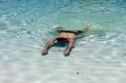 Délben a Pelican zátony mellett dobtunk horgonyt. Körülöttünk felhők tornyosultak és a barométer is folyamatosan esett, de felettünk szépen sütött a nap, ezért ebéd után kibociztunk a homokzátonyra fürdeni. Nem mi voltunk az egyetlenek. Az utikönyvek azt írják ezken a részeken sok a cápa, ezért nem szabad mélyvízben fürdeni, de a homokpad körüli sekélyes rész védelmet nyújt, mert ideág nem jönnek ki a fenevadak. Az idegeink még nem szokták meg, hogy a vízmélység 15-ből gyakran 3-4 méterre csökken. A homokzátonyok vándorolnak ezért a térképek nem jók és ráadásul a víz színe néhány helyen olyan zöld, mint a Balatoné, ezért a vízre nézve még a körülbelüli mélységet sem látjuk.