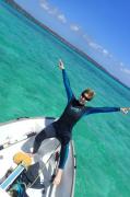 | 20. nap, 2015.08.12. , Hoga sziget (Wakatobi régió) | Újra türkiz víz | | Hurrá sznorizunk | Hajnalban érkeztünk a Hoga szigethez (24 mérföld Wangi Wangi városától). Miközben elhajóztunk 2 sziget mellett (Waha és Palahidu), volt internet, de ahogy ideértünk, nem működött. Megvártuk a napfelkeltét, mert Hoga sziget egy atol és csak jó láthatóságban szabad behajózni, még úgy is hogy van egy jelzőpózna a bejáratnál. Közben gyorsan rádióztunk az SSB-n a rally hajókkal, a net minden reggel fél nyolckor megy. Érdekes hallani, ki merre tart. Jelenleg nem sok szél van délen Flores mellett és nagy a döghullámzás, amit valószínüleg az itteni jó szélből kapnak.
