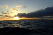 | 19. nap, 2015.08.11. , Hoga atol mellettReggelre a szembeáramlás megszűnt és a szél is csökkent. Estére elértük az első szigetet, a nap pont mögötte bukott le. A sziklaszigeten települések fényeit láttuk. Egy vibráló fény egy halászhálót is jelzett. Gondoltuk, jó lesz figyelni. Nincs hold ezért vak sötétség van a tengeren. Egyszer csak egy villanó fényre lettünk figyelmesek, meg még egyre a másik irányból. Azután a motor zümmögését is hallottuk. Halászhajók. Ennek fele sem tréfa, itt halásznak körülöttünk kivilágítatlanul. Indonéziában a halászhajókon nem használnak navigációs fényeket. A legjobb ha az ember elemlámpával vagy reflektorral villogtat és akkor van esélye, hogy visszavillantsanak neki. Ekkor már csak a hajók poziciójára kellene emlékezni. Mi abban biztunk, hogy a mi navigációs fényünk látják és akkor elmennek előlünk.