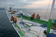 Azt mondjak, Alor-tol eszakra mar nem nagyon van szel, de jelenleg jo szel van, ez lehet, hogy az El Nino hatas. Fel szelben (15-20 csomo) haladunk eszsakra. Szerencsenk van a szellel, mert ezt a szakaszt biztos nem akarnank lemotorozni, ugyanis 2-2,5 csomos eros szembearamlas van. Ezert meg ebben a szelben is nagyon lassan haladunk (2,5-4 csomo kozott).