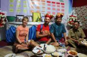 | 25. nap, 2015.08.17. , Csöbörből vödörbe | Függetlenségi nap öltözet | Ma van Indonézia függetlenségi napja. De a halászok továbbra is itt árulják a halaikat. Vettünk tőlük egy szép tonhalat (tíz dollárért, amit idehoztak a hajóhoz, persze a piacon olcsóbb lenne) és tonhal steak-et készítettünk belőle. Az elmúlt két napban a sznorkelezésen kívül a dinghy-boardozásnak hódoltunk. Közben közel húsz hajó érkezett be az atolba, melyet már-már magunkénak tudtunk, miután a mexikói és az ausztrál hajók is elmentek. Arról még nem írtunk, hogy indonéziában indult még egy rally, új-zélandi szervezésben Cairns-ből, és ezek a hajók (kb ötven hajó) most kezdenek utolérni minket. Egy kicsit más az útvonaluk, mint a mi rallynknak, de érdekes elképzelni, ahogy száz hajó beérkezik majd Lombokba, mert végül minden út ide vezet. Meghívtak minket egy sörözésre a helyi hotel éttermébe. Most már érezzük, hogy ideje továbbindulnunk, mert az atol is elveszti igazi varázsát és nyugalmát ennyi hajóval.