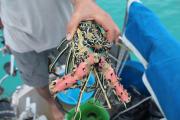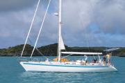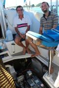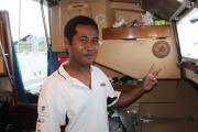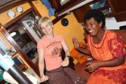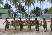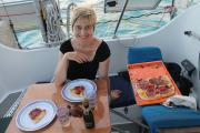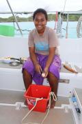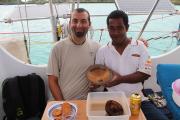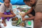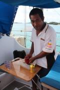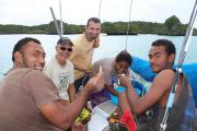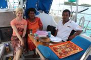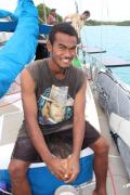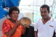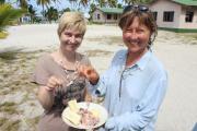 It was Sunday and our rest day.. | 22. day - 12/08/2013 - , Farewell from the sailors who are leaving usWith the Italian boat we prepared a farewell party for Caps Tres. They plan to go to Suva. We knew they love the lobster, so we prepared it for them. The locals saw us looking for it, so they came by and brought one for us. . | 23. day - 13/08/2013 - , Visitors on the boatWe went back to the village because we invited one of the families to the boat. Salote and her husband, Mini visited us . He would have liked us to drink kava together. The village has only one cooler at the school , and only a couple of houses have ovens. Therefore, we thought that the fried pizza will be nice for the event. But as usual our guests did not arrive empty-handed. Mini carved us a kumete (like a tania bowl just much smaller). It was a great surprise for us with his happy anniversary carving on it. He can complete one just within a few hours. So he began it at 6 am today to be able to finish for the afternoon party started at 2pm. Salote finished a palm leafed bag on the boat. In addition, kava was crushed and we drank it with rain water. They also brought fish prepared in coconut juice and boiled cabbage leaves and cassava. They liked the pizza. Constantly repeating that Maleka (which is delicious ) .