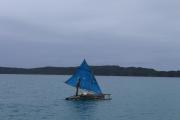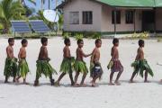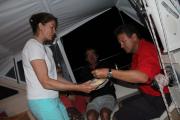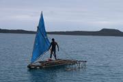 In the evening we took Salote back to the boat because her finger was still bleeding. It turned out that her mother is the nurse on the island, but there are no drugs. We offered her what we could and she was very pleased. . | 25. day - 15/08/2013 - We spent four weeks at Fulaga. This was our first trip where we had a tearful goodbye from the locals. We went into our friends house for a last word. The chief seemed to be better and welcomed us to his house for the farewell. We also got some vegetables from Shalote , cassava and pumpkin . Master Joji was waiting for us and Ma with weaved birds. Against mosquitoes we got a home-made fan . We gave them a Rubik cube in return , and all the videos and images were copied to their computer that we took in Fulaga. Tao, the principal said that the kids will remember Rotor as well and the common funs : sack racing, dancing , etc.