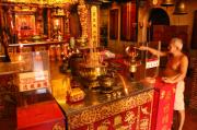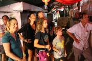 Első utunk egy food courtbe (olyan udvar, ahol olcsóbb kifőzdék működnek, különböző étel kínálatokkal) vezetett, majd a bejelentkezés után (a kikötő kapitányságon) egy kínai templomot (Hean Boo Thean Kuan Yin Temple) akartunk megnézni a tengerparton (erre pont ráláttunk a hajóról). Ahogy kiszálltunk a taxiból, egy csapat oroszlán táncos (lion dance) és petárdások (fire crackers) vonultak el előttünk. Mi rögtön rohantunk utánuk. A kínai hokkienek új évi ünnepe volt ez. A menet a sárkánytánccal otthonok és templomok előtt vonult el. Néhány templomban (pont a Kuan Yin-ben, amit kinéztünk magunknak) nagy dobpergéssel és sárkány és oroszlán táncokkal ünnepelték az új évet. A menet egészen Chew klán molójához ment vissza, ahol folytatódott az ünnepség és a vegetáriánus étel osztás, amivel minket is kínáltak.