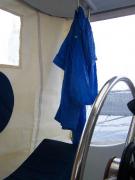 Miután meguntunk a hátulról folyamatosan beverődő esőt, előkerült a hajó mélyéből a kamion-kokpit-ponyva. A hajót előző tulajdonosa a Balti-tengeren használta, és ott gyakran elkelt ez a ponyva, ami a kormányállást teljesen körbezárja, oldalt, hátult ablakokkal. Most mi is kipróbáltuk. Tényleg olyan, mintha egy kamion vezetne az ember (bár még kamiont nem vezettünk, de ilyennek gondoljuk). Nagyon kellemes. Nincs szél, nincs eső.