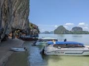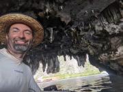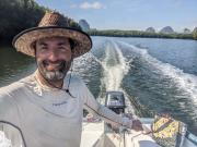 | 63. nap, 2022.04.22. , Barlangászunk és fürdünkMa is barlangászunk. Feltettük a nagyobb motort a bocira, mert elég nagyok a távolságok. Így is elgémberedik a lábunk, a bociban ülve, mire visszaérünk a hajóra. Nem tudunk elszakadni ettől a horgonyzóhelytől. És ami igazán különleges, hogy rajtunk kívül, nincs itt senki, csak a halászok robognak el néha mellettünk a hosszúfarkú csónakjukon. A fürdés selymes vízben történik (olyan, mint a Balaton vize a melettünk levő mangrove-től és iszapos talajtól), napi kétszer, amikor megáll az áramlás a hajó körül. Esténként jön egy kisebb vihar, de nem tart fél óránál tovább. A turistákat pedig tőlünk messzebb viszik a James Bond sziklához.